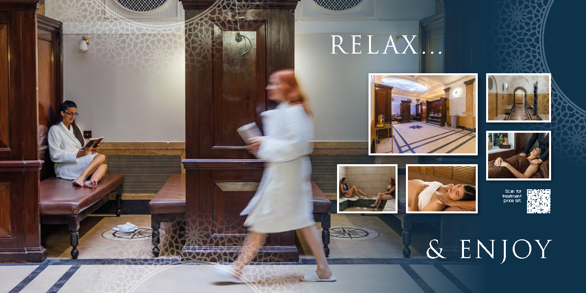 Step into the beautifully restored Turkish Baths, a truly unique and luxurious setting for rest and rejuvenation. With traditional mosaic tiles, ornate wooden screens, and Islamic arches, it’s a peaceful escape designed to soothe both body and mind. At the heart of the experience is our signature Turkish Bath journey, available as a standalone ritual or combined with our full range of spa treatments. This invigorating experience involves a series of heating, cooling, and cleansing stages to leave you feeling refreshed and revitalised: